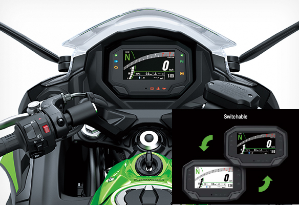새로운 4.3 인치 풀 디지털 TFT 컬러 계기 – Kawasaki 600cc 클래스 최초 – 는 콕핏에 하이테크, 고품질 외관을 제공합니다. 새로운 미터는 이전 모델에서는 사용할 수 없었던 추가 기능도 제공합니다. 고급 풀 컬러 디스플레이에는 TFT (박막 트랜지스터) 기술이 적용되어 높은 가시성을 제공합니다. 화면의 배경색을 선택할 수 있으며(검정/흰색) 화면 밝기는 적합한 밝기로 자동 조정됩니다. 디스플레이 기능에는 디지털 속도계, 디지털 바 스타일 타코미터, 기어포지션 인디케이터, 시프트 램프, 연료 게이지, 오도미터, 듀얼 트립 미터,현재 및 평균 연료 소비, 잔여 범위, 평균 속도, 총 시간, 냉각수 온도, 시계, 배터리 전압, Kawasaki 서비스 알림, 오일 교환 알림 및 경제 주행 인디케이터가 포함되어 있습니다.
